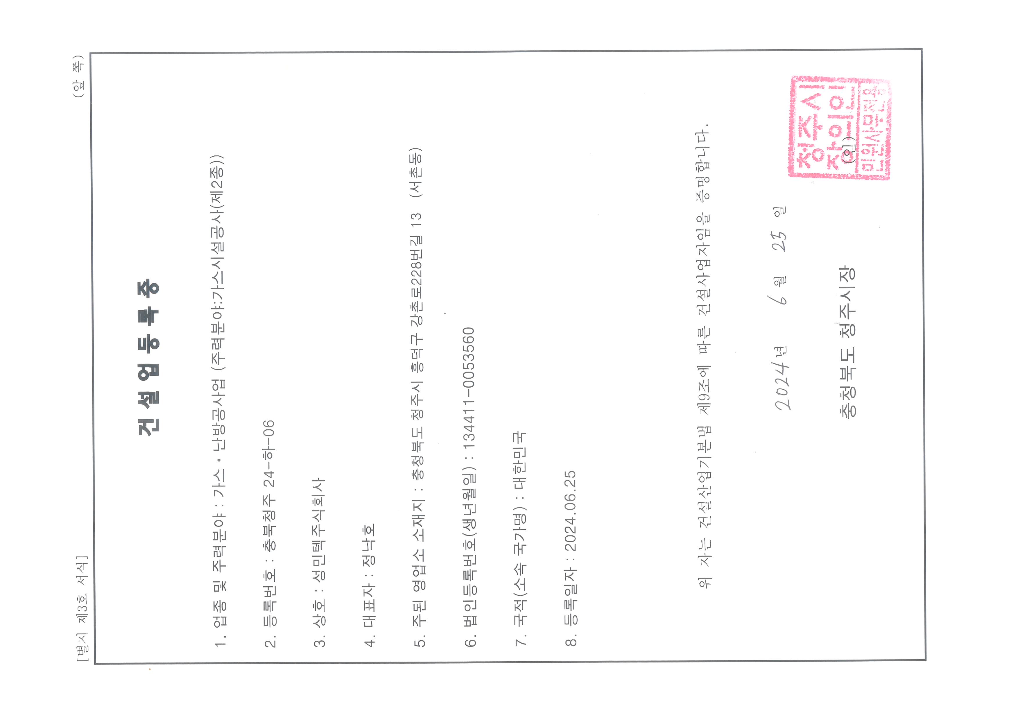 가스시설공사등록증
